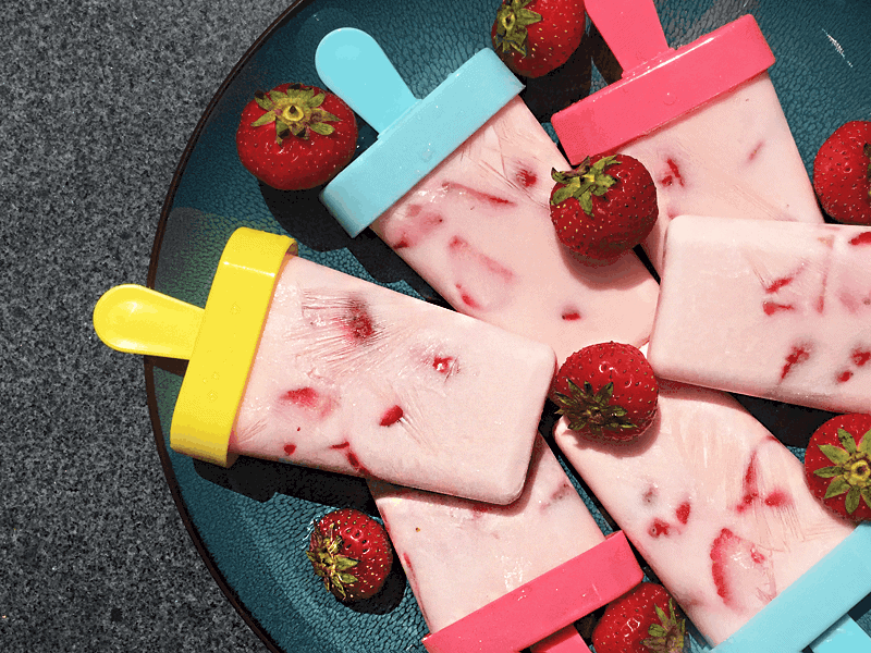 Heerlijke verkoelende ijsjes tijdens deze hittegolf. En nog gezond ook, dus nu kun je zelfs verantwoord een ijsje nemen als ontbijt! Het enige wat er in zit is de zelfbereide aardbeienyoghurt van Easiyo en aardbeien. Hoe makkelijk kan het zijn?!