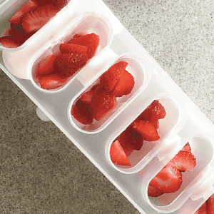 - Snijd de aardbeien in stukjes en vul de ijsvormpjes hiermee tot net onder de rand.