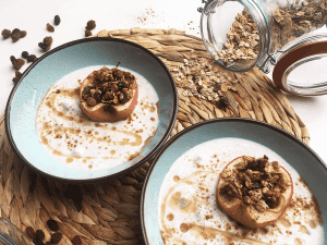 Heerlijke warme appeltjes gevuld met pecannoten en muesli uit de oven in appelkaneelyoghurt. Een feestje als ontbijt of lekker, maar gezond tussendoortje! Dit recept is geschikt voor 2 grote porties of 4 kleine porties.