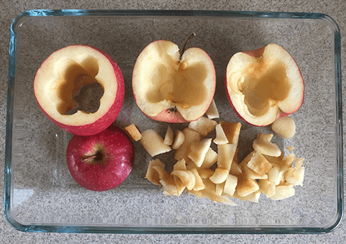 - Halveer de appels en haal het klokhuis eruit. Hol de appel verder uit. Zorg er voor dat de “schil” ongeveer 1 cm dik blijft. Bewaar het vruchtvlees wat over blijft voor de yoghurt. Doe eventueel wat citroensap op de appels als deze bruin beginnen te kleuren.