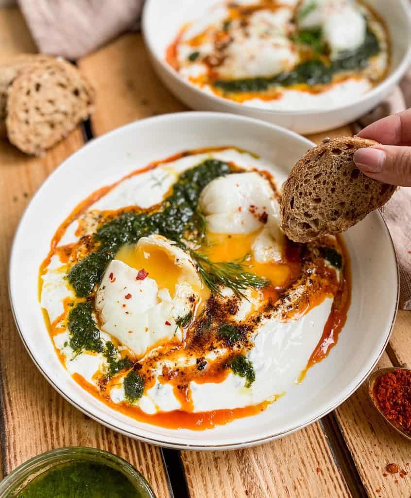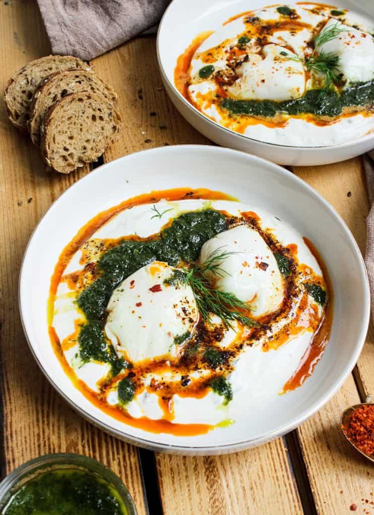 Çilbir (spreek uit als tsjulbur) wordt ook wel simpelweg ‘’Turkse eieren’’ genoemd, het gerecht vindt haar origine namelijk in Turkije. Het is een eeuwenoud gerecht dat in Turkije traditioneel als ontbijt of lunch wordt gegeten. Yoghurt met eieren? Deze combinatie zal je waarschijnlijk niet eerder hebben gezien. Maar eerlijk, dit gerecht is echt een smaakexplosie. De romige knoflookyoghurt met de pittige botersaus en kruidige salsa verde zijn het perfecte bedje voor 2 warme gepocheerde eitjes.