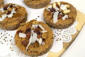 Steek met een ronde koekuitsteker ronde koeken uit de plak. Besmeer deze met wat yakonsiroop. Bestrooi met de kokossnippers, rozijnen, pinda’s en moerbeien