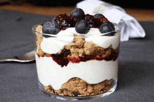 5. Verdeel de hangop over de schaaltjes en schenk de warme saus erbij.