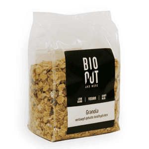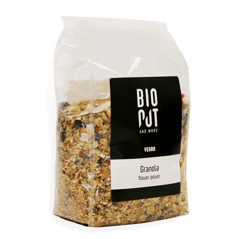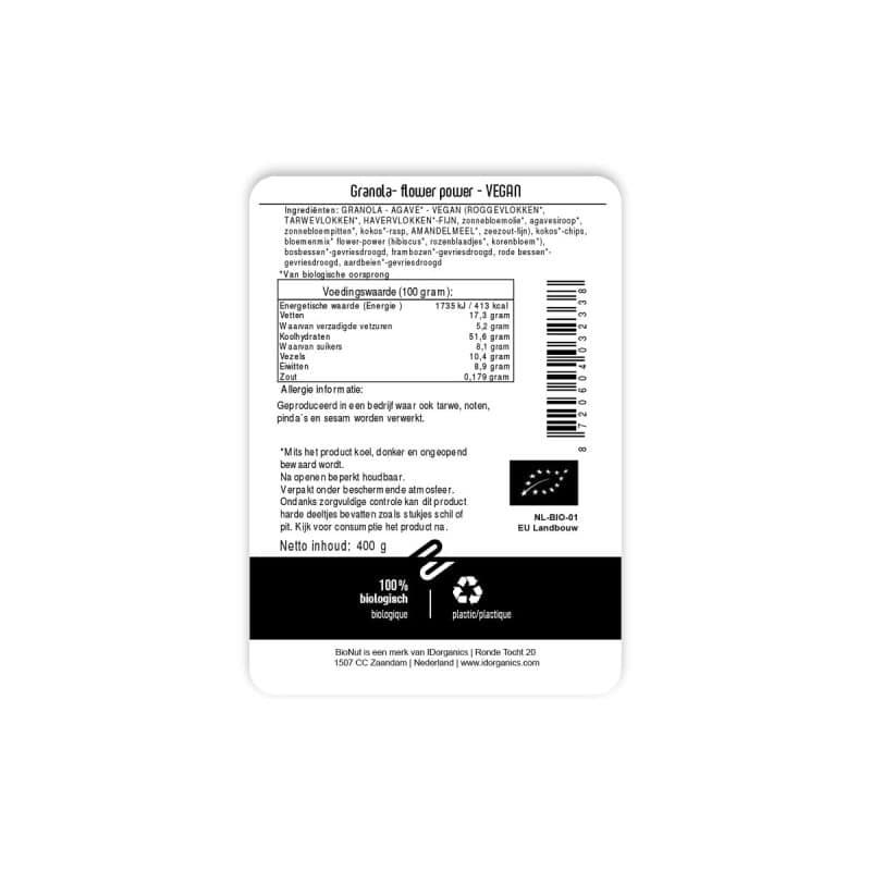 Granola – agave * (tarwevlokken*, havervlokken – grof*, havermout*, zonnebloemolie*, agavesiroop*, zonnebloempitten*, gedroogde kokosnoot*, amandelmeel*, zeezout fijn.), kokoschips*, bloemenmix – flower power* (hibiscus*, rozenblaadjes*, gevriesdroogde bosbessen*, gevriesdroogde frambozen*, gevriesdroogde rode aalbessen*, gevriesdroogde aardbeien*.