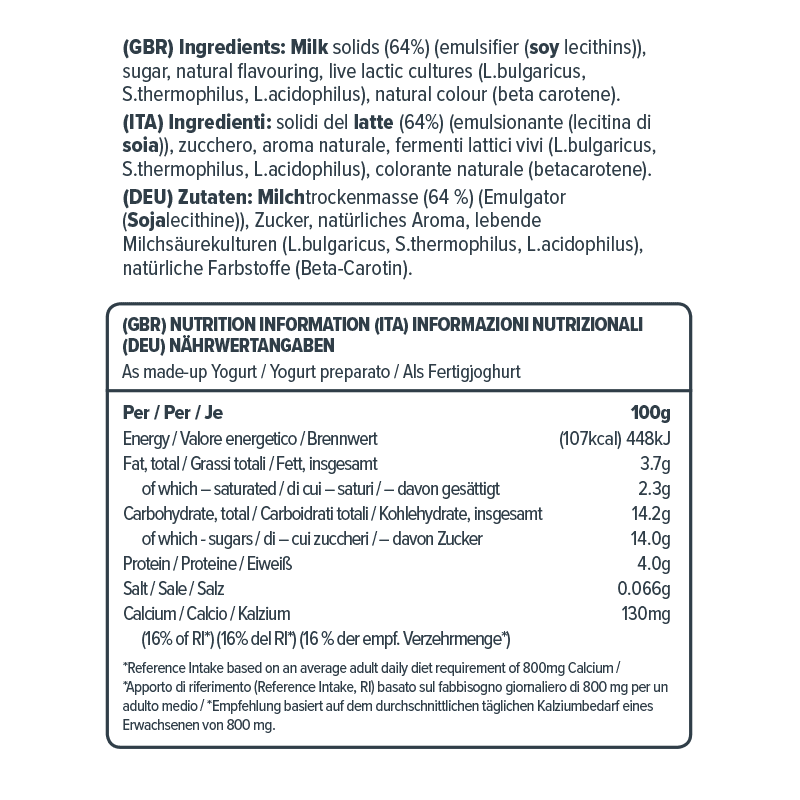 Onze yoghurtmixen bevatten alleen natuurlijke ingrediënten – geen kunstmatige kleurstoffen, aroma’s of conserveermiddelen.