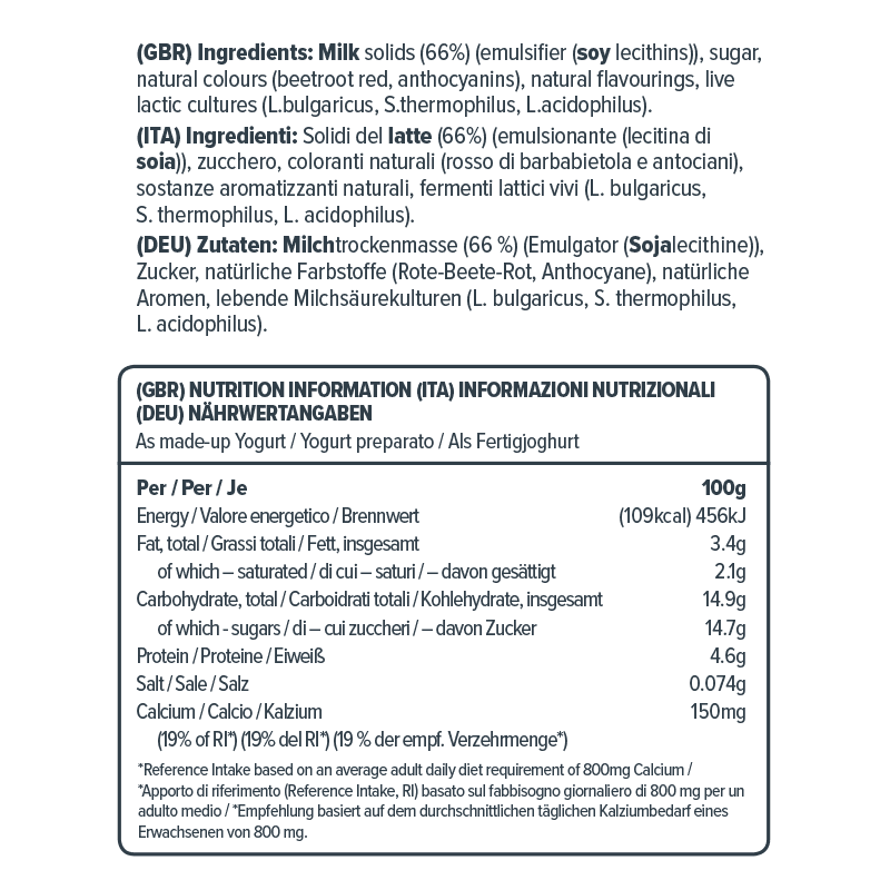 melkpoeder (66%) (emulgator (soja lecithinen)), suiker, natural kleurstofs (beetroot red, anthocyanins), levende yoghurtculturen (s.thermophilus, l.bulgaricus, l.rhamnosus, l.helveticus, l.acidophilus), natuurlijke smaaking Bevat Melk en Sojaproducten
