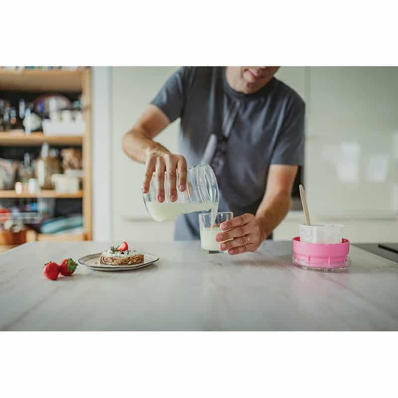 Wordt gebruikt om de wei die overblijft op te vangen. Door de ring met aangehechte gaasmand op te tillen is deze eenvoudig te legen en weer te gebruiken. De capaciteit van de Kefirko-kan is 1,4 l.