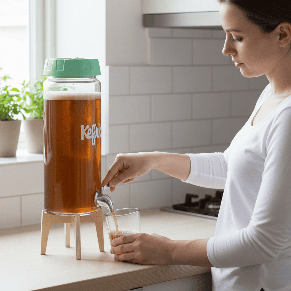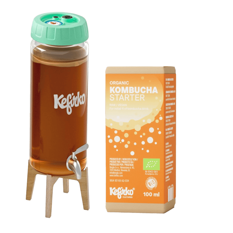 Dit complete pakket bevat alles wat je nodig hebt om te beginnen: de KefirKo Kombucha Fermenter (4 liter) met handig kraantje en standaard, de biologische startercultuur (SCOBY) en optioneel thermometerstrips voor perfecte controle tijdens het fermenteren.