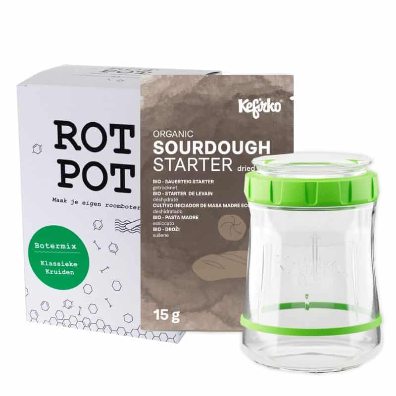 KefirKo Zuurdesem Fermenter Met de Zuurdesem Fermenter van KefirKo maak je eenvoudig je eigen zuurdesembrood. Zuurdesemstarter Zuurdesemstarter voor de bereiding van vers, krokant zuurdesembrood. Met deze biologische zuurdesemcultuur in gedroogde vorm bereid je eenvoudig je eigen zuurdesembrood. RotPot Roomboter Complete kit om zelf gefermenteerde (kruiden)boter en karnemelk te maken. De kit komt met kant-en-klaar kruidenzout en een bacteriestarter.