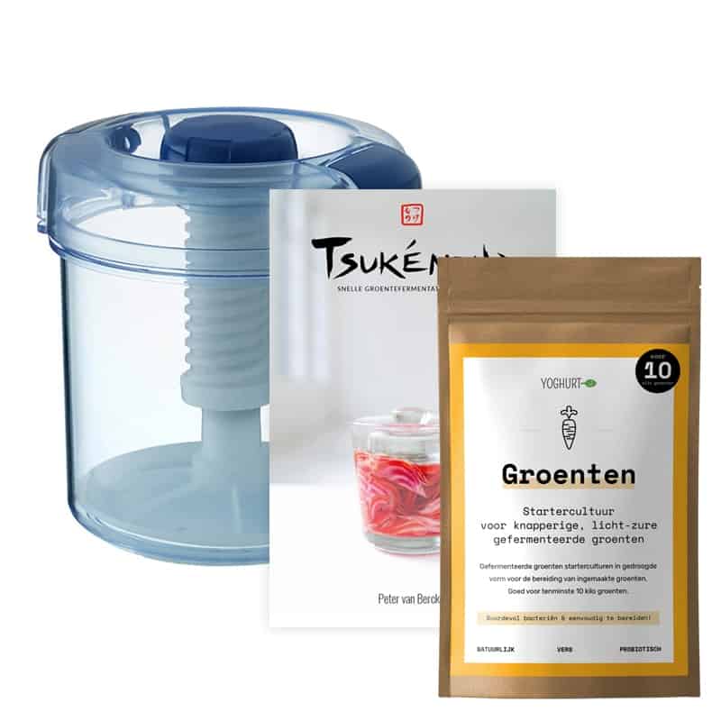 Inhoud: 1,7L Boek: Tsukémono, snelle groentefermentaties uit Japan Tsukémono is de Japanse verzamelnaam voor gefermenteerde groenten, wat wij in het westen pickles noemen. In Japan worden tsukémono-pickles bij iedere maaltijd als bijgerecht gegeten. In zijn boek leert Peter van Berckel je op een eenvoudige en snelle manier knapperige en gezonde groentegerechten te maken met behulp van de zgn. pickle-pers techniek. Je kunt kiezen uit meer dan vijftig – veelal vegan – traditionele Japanse recepten en pickles uit de westerse keuken. Als toegift geeft hij in het boek handzame informatie over vitale voeding als boost voor je dagelijks leven. Gefermenteerde groenten starter Gefermenteerde groenten startersculturen voor ten minste 10 kilo gefermenteerde groenten. Met deze startersculturen kan je eenvoudig diverse groenten fermenteren zoals komkommer, selderij, bonen, bieten, asperges, paprika en nog veel meer.