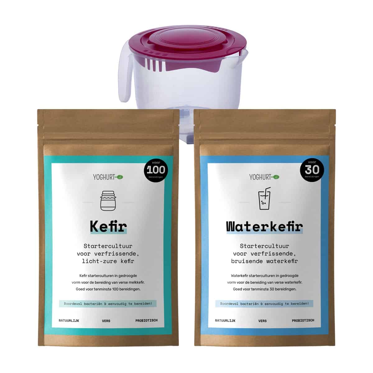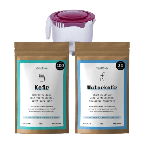 Aan de slag met het maken van je eigen kefir? In dit pakket zit zowel melkkefir als waterkefir en een handige kan waarin beide kefir starters bereid kunnen worden.