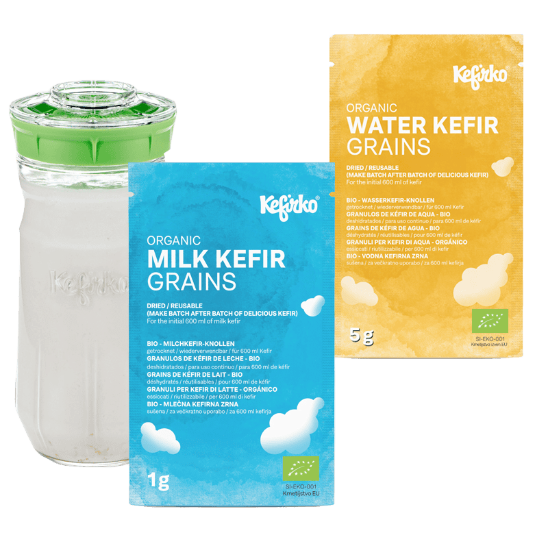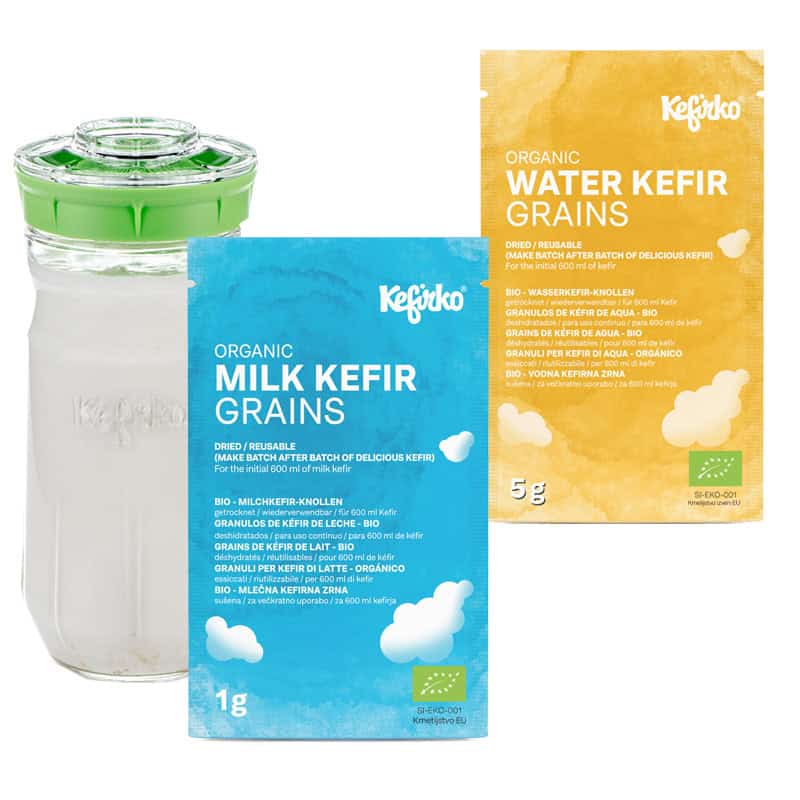 KefirKo Kefirmaker (1,4l) Kefirmaker (1,4l) voor de bereiding van melk- en waterkefir met melkkefirkorrels of waterkefirkorrels. KefirKo Melkkefirkorrels Maak je eigen verse melkkefir met deze biologische gedroogde melkkefirkorrels. De korrels moeten geactiveerd worden voor gebruik. Dit duurt 7 – 14 dagen. KefirKo Waterkefirkorrels Maak je eigen verse waterkefir met deze biologische gedroogde waterkefirkorrels. De korrels moeten geactiveerd worden voor gebruik. Dit duurt 24 – 48 uur.