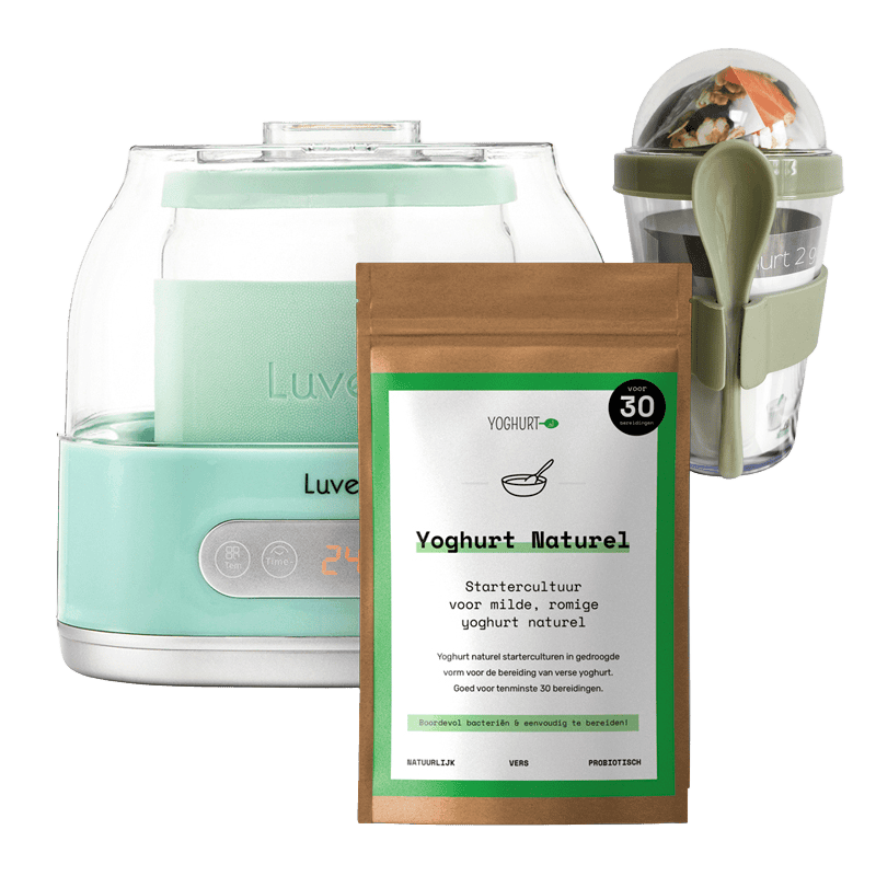 Voor degene die gelijk goed van start wil gaan hebben we dit yoghurt-maak-pakket samengesteld. Met de premium yoghurtmaker van Luvele en onze eigen yoghurtculturen wordt zelf yoghurt maken een fluitje van een cent!
