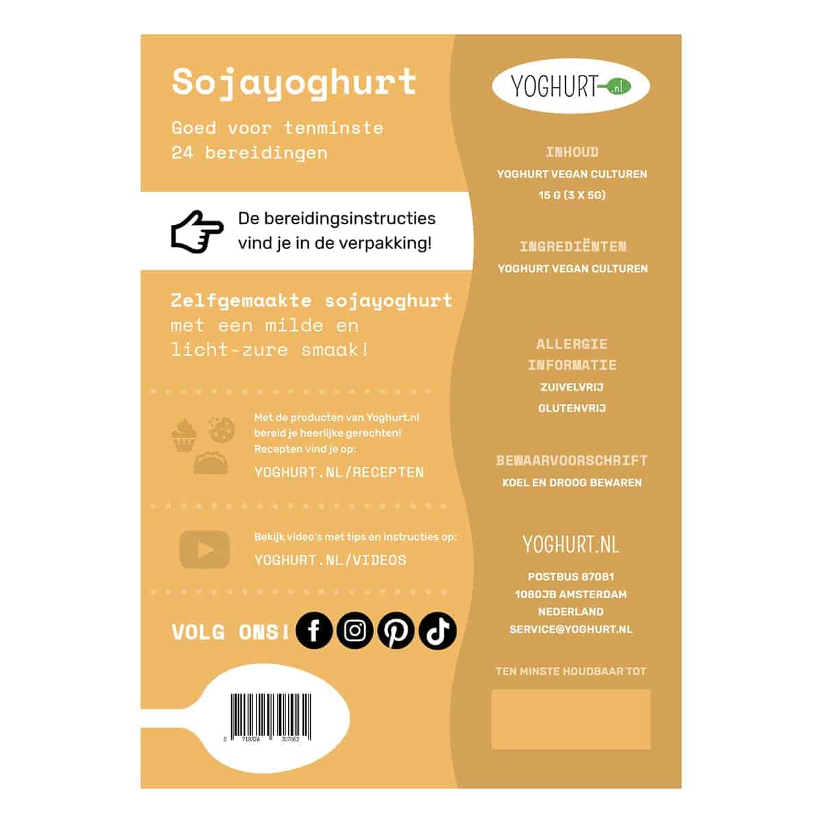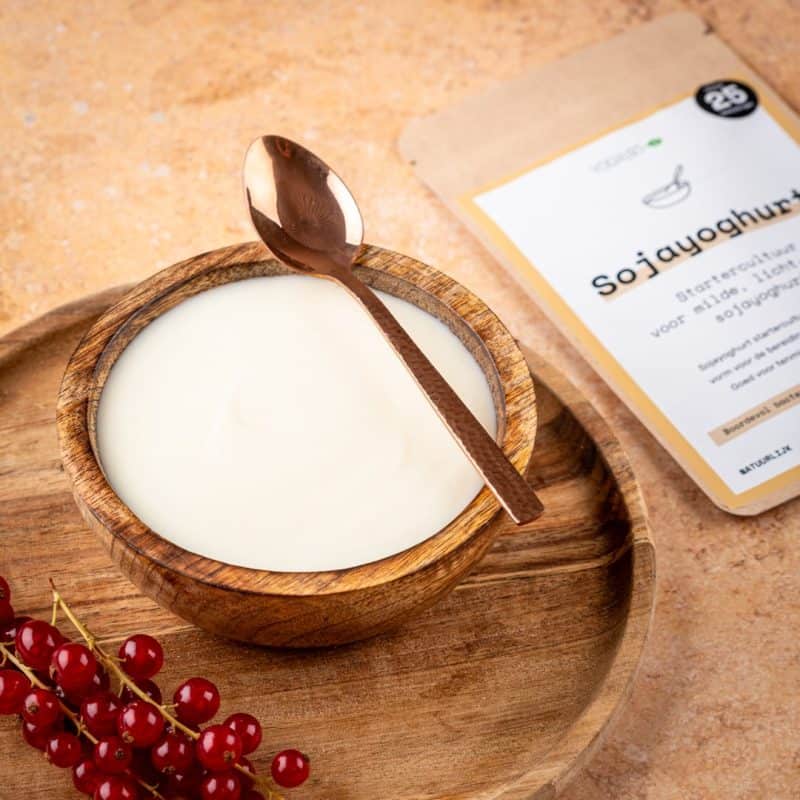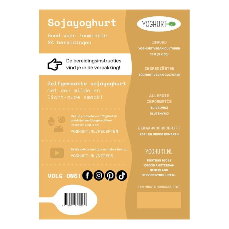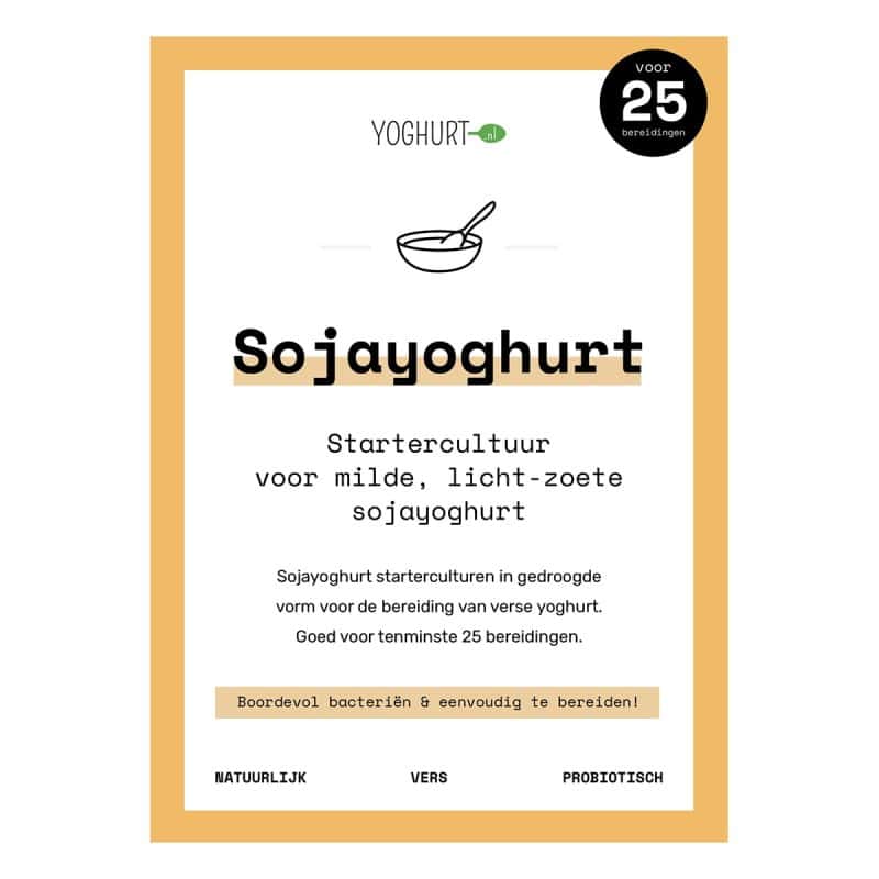 Met deze starterculturen kun je eenvoudig yoghurt op basis van sojamelk bereiden. De sojayoghurt heeft een milde en licht-zure smaak. Het product bevat 3 zakjes met verse vegan yoghurtculturen. Met één zakje kun je 8 keer yoghurt bereiden. Afhankelijk van de gewenste hoeveelheid kun je per bereiding tussen de 300 en 600 ml sojayoghurt maken.