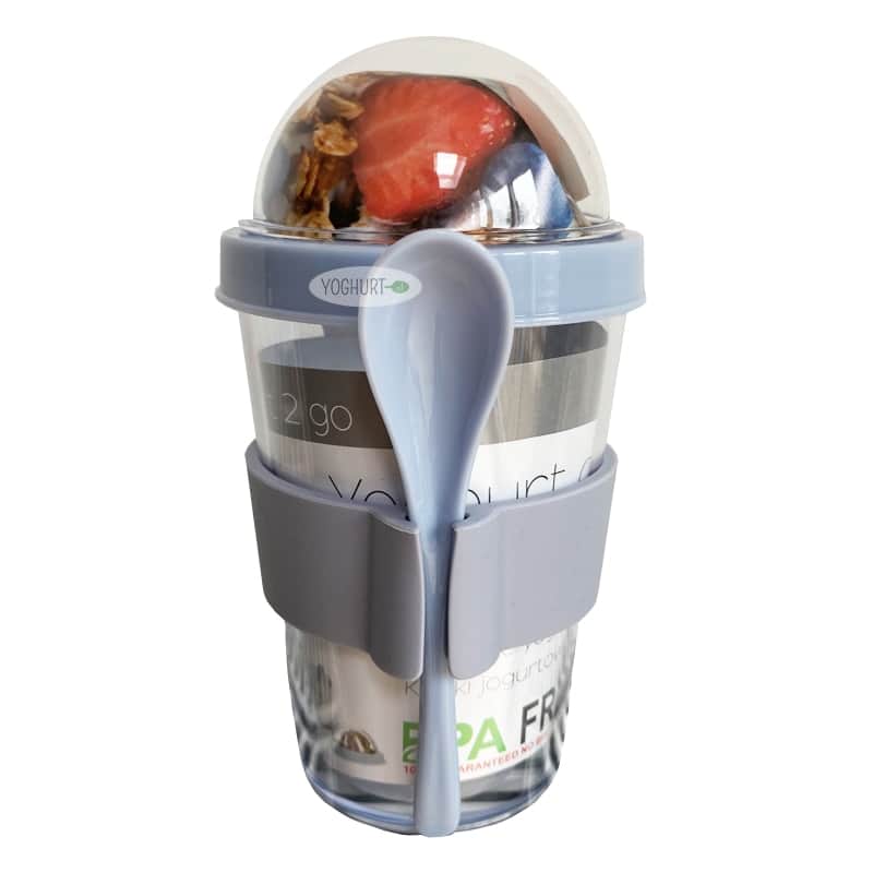 Plastic yoghurtbeker met een aparte ruimte voor bijvoorbeeld muesli, granola of fruit. Hierdoor blijft de muesli knapperig. Bij de yoghurtbeker zit een lepel. Inhoud van de beker is 330ml. 110ml voor muesli/fruit. Ideaal om mee te nemen naar bijvoorbeeld het werk.