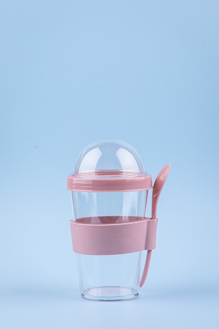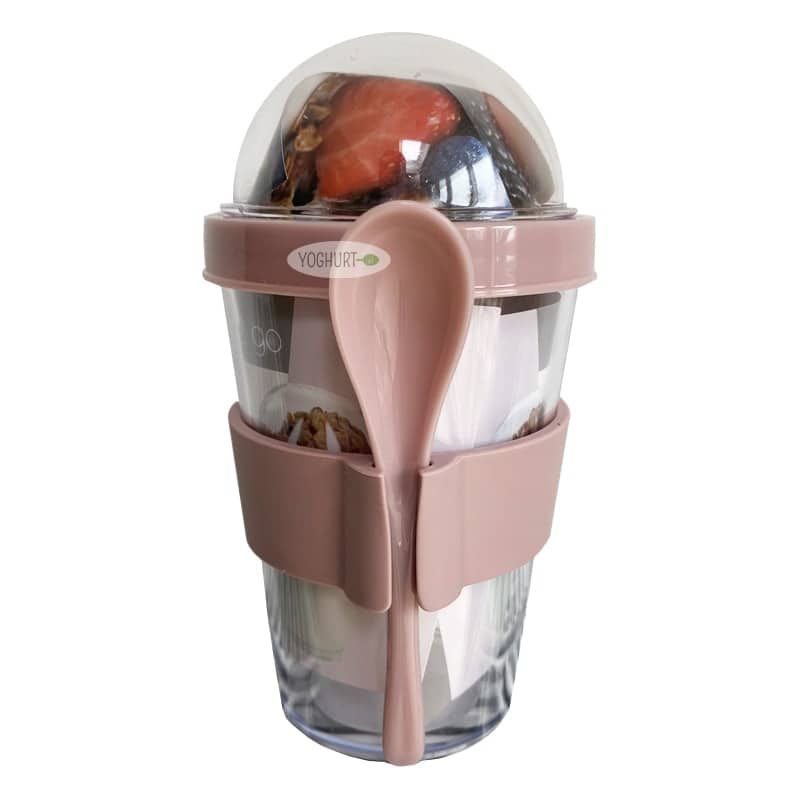 Ook yoghurt meenemen naar werk, school of op vakantie? Gebruik dan deze praktische yoghurtbeker! De yoghurtbeker is gemaakt van plastic en heeft een apart vakje voor je favoriete topping. De yoghurt eet je met de bijgevoegde lepel. Geen geknoei en ideaal om mee te nemen!