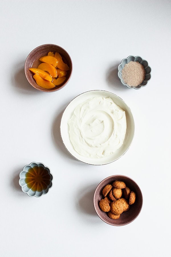 Zoek je nog een toetje voor het kerstdiner dat minimum input, maximum output is? Zoek niet verder! Je kunt het dessert de avond van tevoren al maken en de avond van het diner slechts afmaken met de kaneelsuiker. Hoe langer je het toetje laat staan, hoe meer de smaken van de amaretto en perzik in de bitterkoekjes trekken. Met de yoghurt van yoghurt.nl kun je perfect de dikte van de yoghurt bepalen en onder controle houden. Iets wat voor dit gerecht goed van pas komt, omdat je een dikkige yoghurt wil hebben. Denk aan Griekse of Bulgaarse yoghurt.