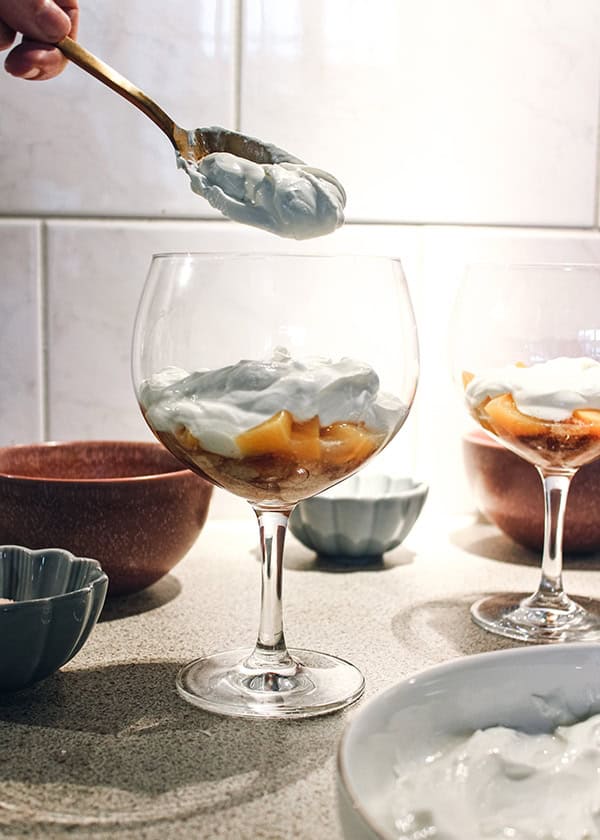 Tiramisu met bitterkoekjes, perzik, amaretto en kaneelsuiker