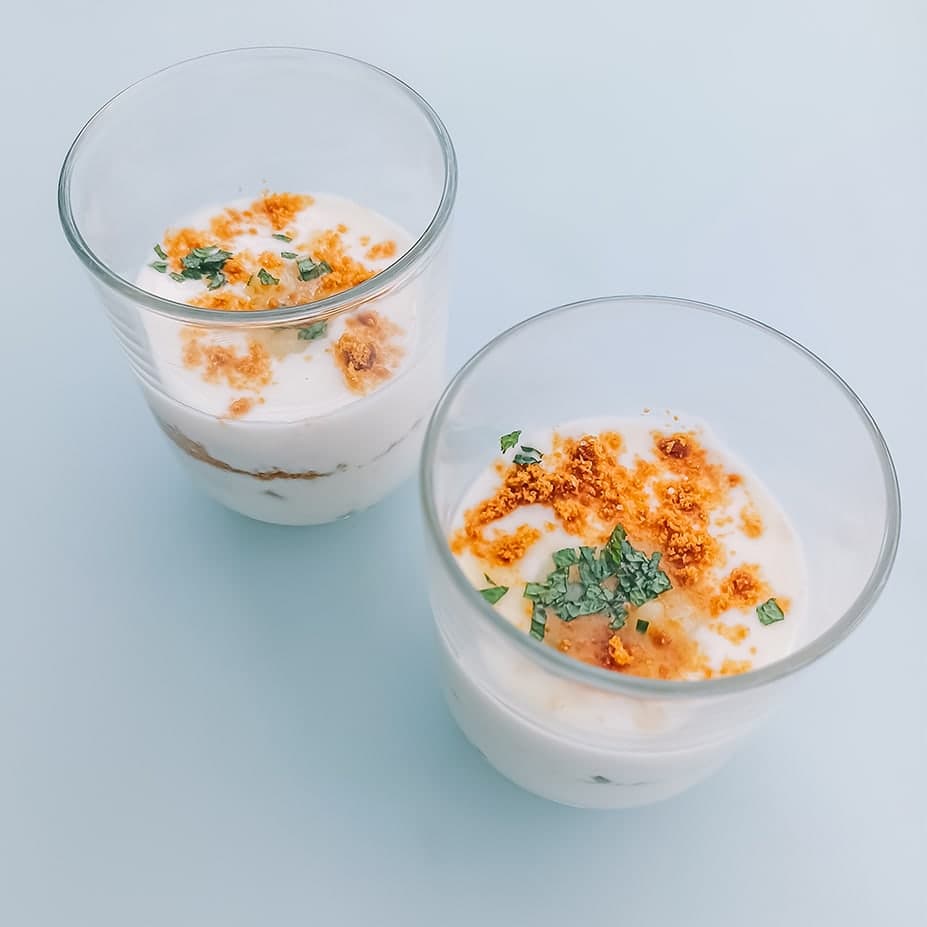 - dresseer glaasjes met laagjes van peer, speculoos en je zelfgemaakte yoghurt. Werk af met munt.