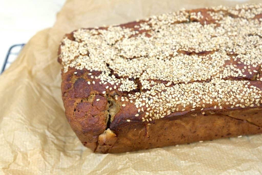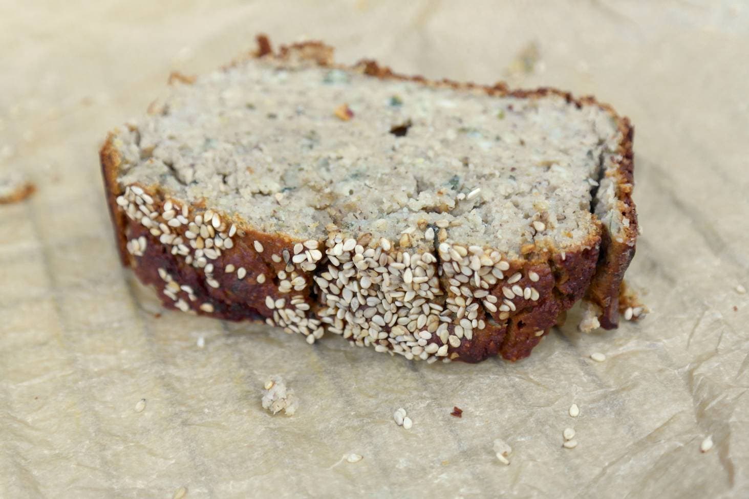 Verwarm de oven voor op 185 graden. Vet een middenmaat vierkant bakblik in met kokosolie, bekleed met bakpapier. Maal alle ingrediënten voor het brood in de keukenmachine tot een fijne massa. Stort de massa in de vorm en verdeel. Bestrooi met sesamzaad. Bak het brood in het midden van de oven gaar in ongeveer 45-50 minuten, blijf tussentijds controleren. Laat afkoelen.
